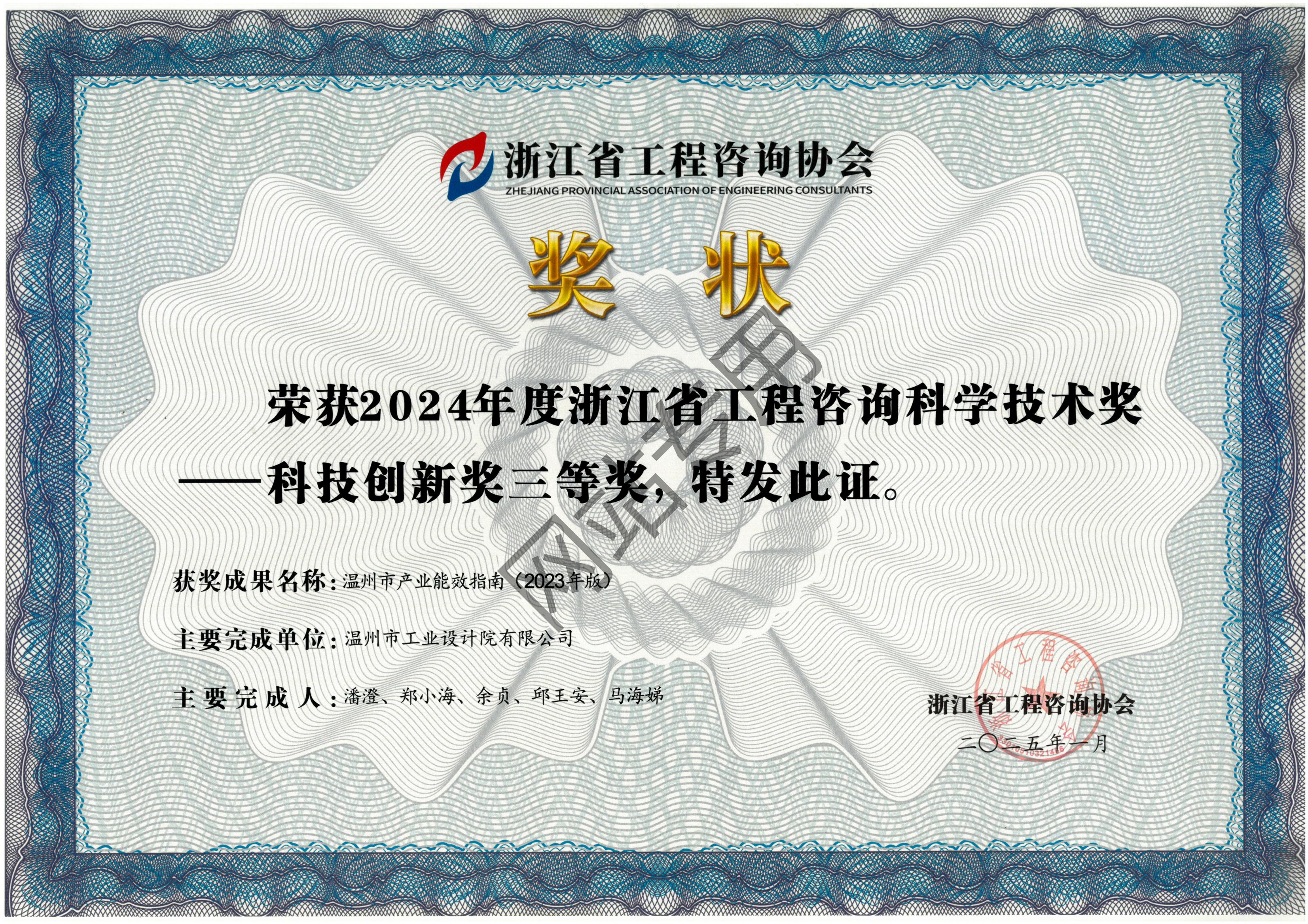 溫州市產(chǎn)業(yè)能效指南(2023年版)項(xiàng)目 2024年度省工程咨詢(xún)科學(xué)技術(shù)獎(jiǎng)—科技創(chuàng)新獎(jiǎng)獲獎(jiǎng)三等獎(jiǎng)